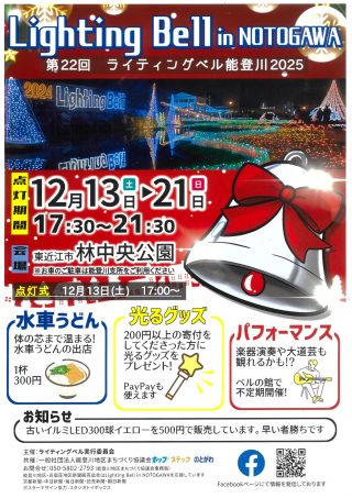 年末の能登川の風物詩としてすっかり定着した「第22 回 2025 Lighting Bell in NOTOGAWA」の開催がいよいよ今週末に迫ってきました。会場である林中央公園では、イルミネーションの飾り付け作業がボランティアの皆様方のご協力を得て、順調に進んでいます。今年の会期は、12/13(土)~12/21(日)までです。12/13(土)17:00から、点灯式を行います。